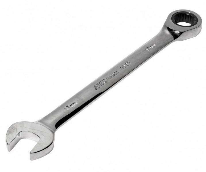 Ключ комбинированный трещоточный 17мм. Предназначен для проведения ремонтных работ автомобиля. Ключ сделан из прочной хром-ванадиевой стали с зеркальной полировкой. Ключ обладает уникальным 72-зубцовым механизмом, обеспечивающим высокий крутящий момент. Угол перемещения механизма в 5° позволяет использовать инструмент в узких и труднодоступных местах автомобиля.